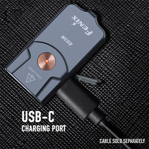 What’s included: Fenix E03R with internal rechargeable battery and split ring (USB-C charging cable and plug adapter available separately – see accessories below)