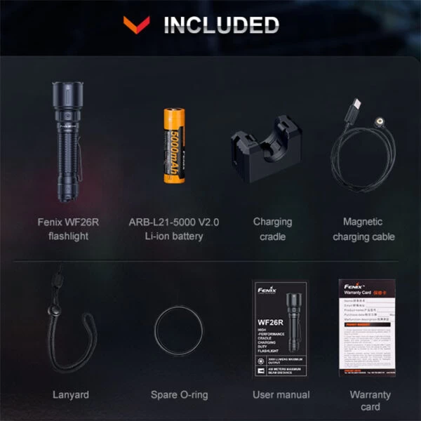 What’s included: Fenix WF26R flashlight, rechargeable battery, charging cradle, magnetic charging cable, pocket clip, wrist lanyard, spare O-ring