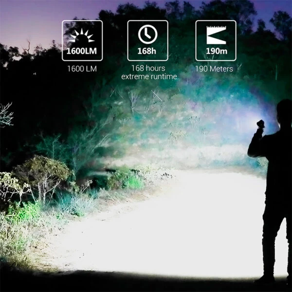☼ High – 1600 lumens, 2.5 hours, 190 meters