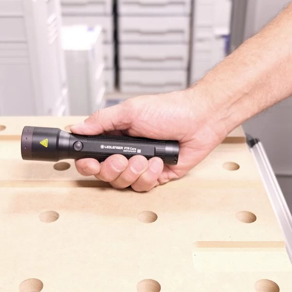 What’s included: LED Lenser P7R Core flashlight, rechargeable battery, magnetic charging cable with USB plug, wrist lanyard (wall plug charging adapter available separately – see accessories below)